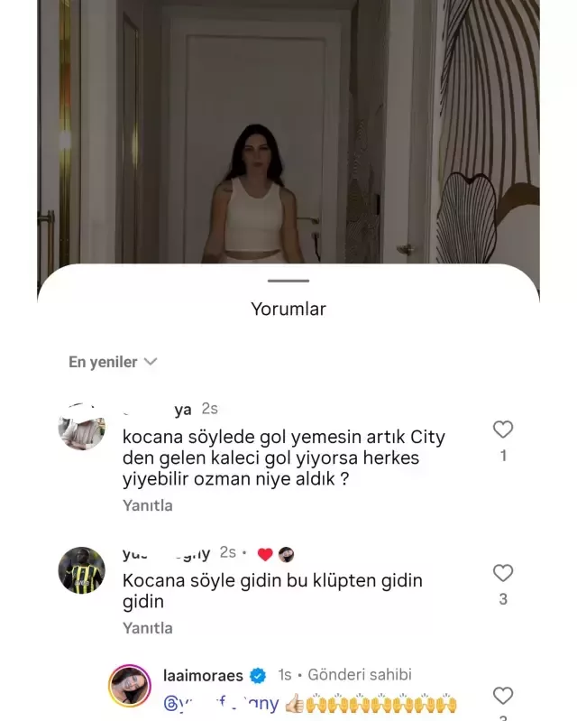 Bir kullanıcı, kaleci Ederson'un eşi Lais Moraes'in daha önce yaptığı bir paylaşımın altına "Kocana söyle gidin kulüpten, gidin" yorumunu yazdı.