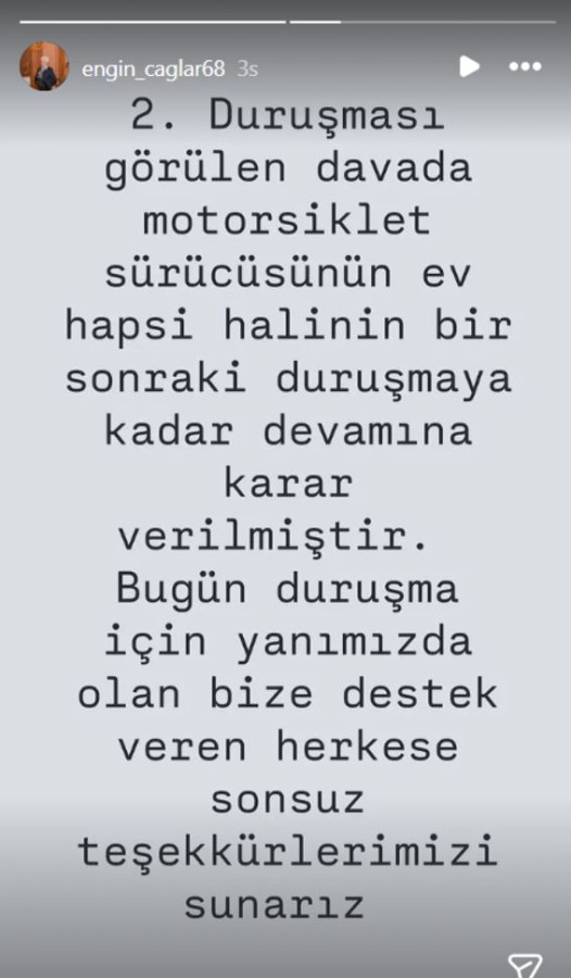Çağlar'a çarpan motosiklet sürücüsü Berkay Orhan'ın yargılandığı davanın ilk duruşması geçtiğimiz günlerde görülmüş ve Orhan, ev hapsi şartıyla tahliye edilmişti. Hakim, tahliye gerekçesinde kazada asli kusurun Engin Çağlar'a ait olduğunu belirtmişti.