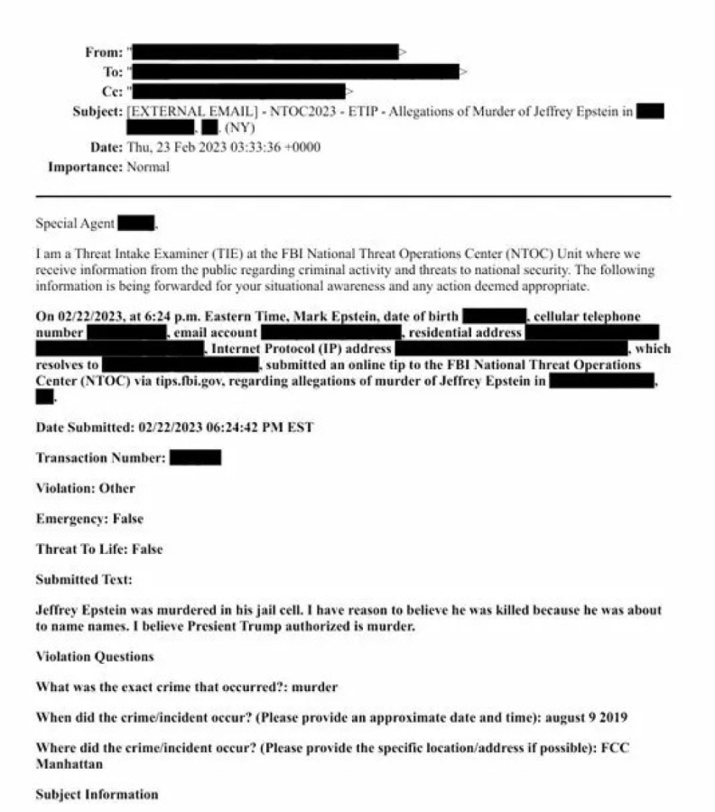 Mark Epstein'in 2023'te FBI'a gönderdiği bir ihbar da bulunuyor.