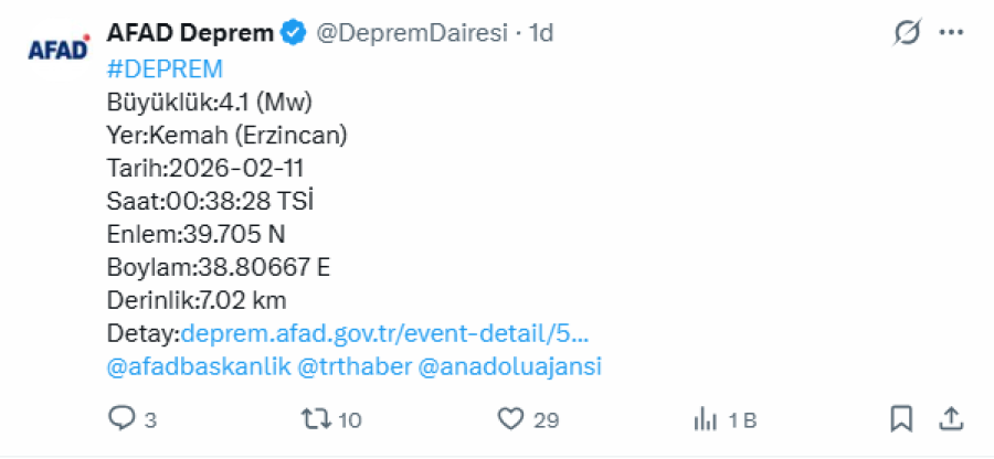 AFAD açıklamasına göre Erzincan Kemah'da 00.38 itibariyle 4.1 büyüklüğünde bir deprem meydana geldi.