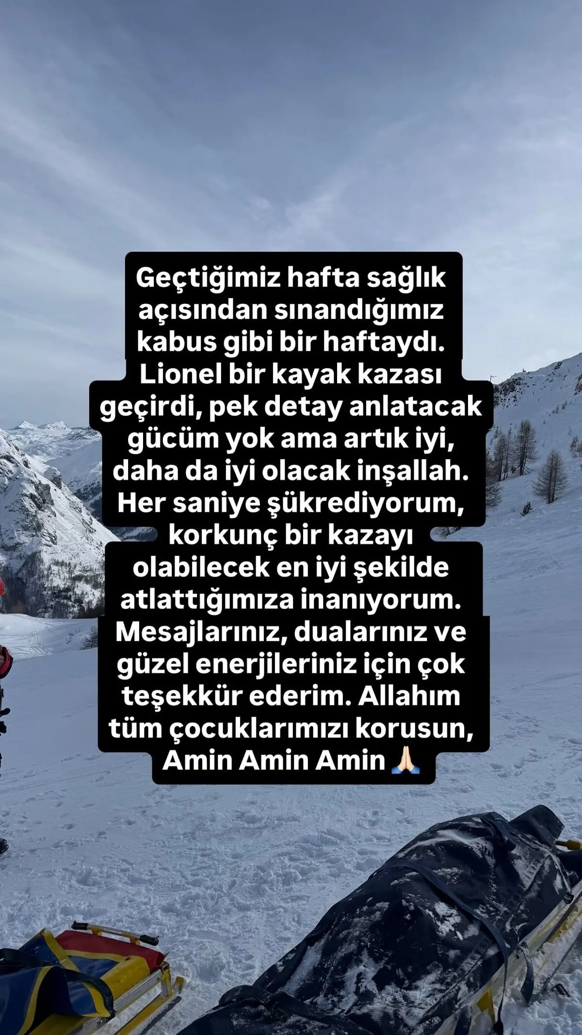 Araz, yaşadıkları süreci duygusal ifadelerle paylaştı ve şu sözleri kullandı: "Geçtiğimiz hafta sağlık açısından sınandığımız kabus gibi bir haftaydı. Lionel bir kayak kazası geçirdi. Pek detay anlatacak gücüm yok ama artık iyi, daha da iyi olacak inşallah. Her saniye şükrediyorum. Korkunç bir kazayı olabilecek en iyi şekilde atlattığımıza inanıyorum."