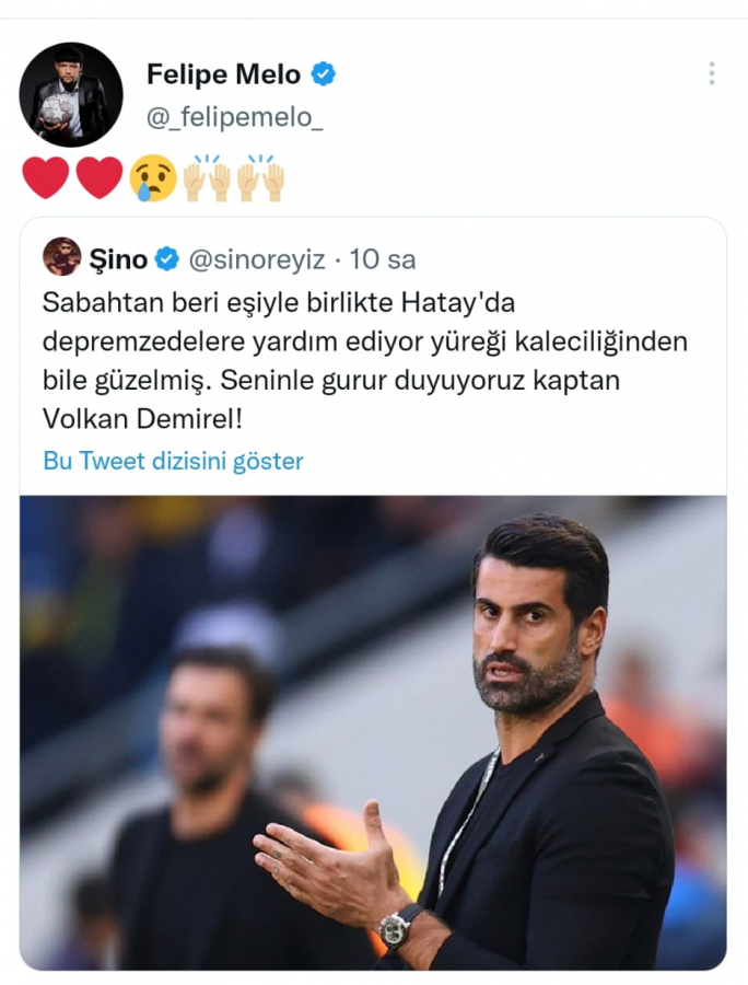 Spor, 2023.02.07 10:07Kahramanmaraş'ta meydana gelen ve 10 ilde ağır hasarlara neden olan depremde, Volkan Demirel sosyal medya hesabından Hatay için yardım istemişti. Galatasaray'ın eski futbolcusu Felipe Melo da Volkan Demirel'in fotoğrafının olduğu bir paylaşımı alıntılayarak, kalp ve üzgün surat emojisi paylaştı.