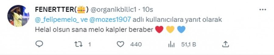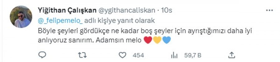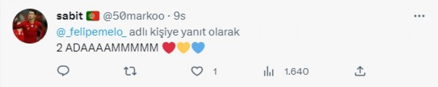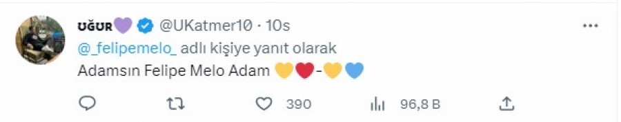 Uzun yıllar Galatasaray'da top koşturan Felipe Melo, Fenerbahçe'nin efsane futbolcularından Volkan Demirel'in paylaşımının olduğu bir gönderiyi alıntılayarak, destek mesajı gönderdi. İkili futbolculuk kariyerlerinde birbirleriyle sürtüşmeler yaşasa da, Brezilyalı futbolcu bu zor zamanlarda Türkiye'ye olan desteğini sosyal medya hesabından gerçekleştirdi.