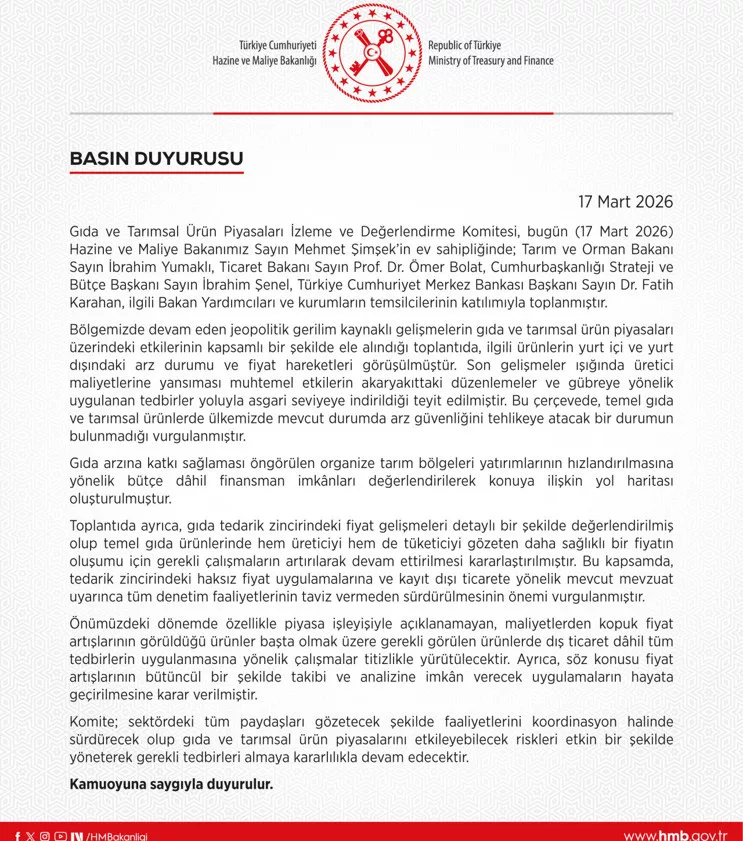 "Bölgemizde devam eden jeopolitik gerilim kaynaklı gelişmelerin gıda ve tarımsal ürün piyasaları üzerindeki etkilerinin kapsamlı bir şekilde ele alındığı toplantıda, ilgili ürünlerin yurt içi ve yurt dışındaki arz durumu ve fiyat hareketleri görüşülmüştür. Son gelişmeler ışığında üretici maliyetlerine yansıması muhtemel etkilerin akaryakıttaki düzenlemeler ve gübreye yönelik uygulanan tedbirler yoluyla asgari seviyeye indirildiği teyit edilmiştir. Bu çerçevede, temel gıda ve tarımsal ürünlerde ülkemizde mevcut durumda arz güvenliğini tehlikeye atacak bir durumun bulunmadığı vurgulanmıştır.