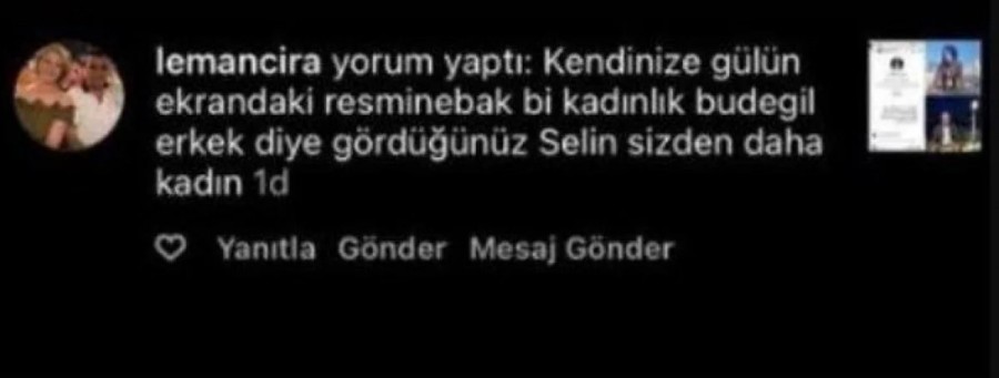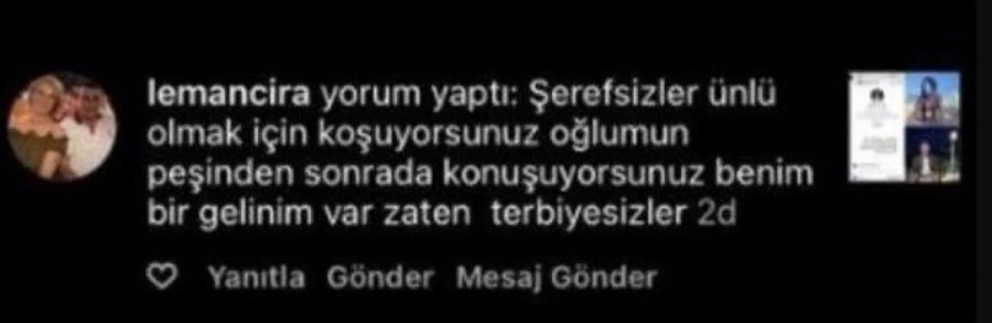 "Şerefsizler, ünlü olmak için koşuyorsunuz oğlumun peşinden sonra da konuşuyorsunuz. Benim bir gelinim var zaten terbiyesizler. Kendinize gülün, ekrandaki resmine bak. Bir kadın bu değil, erkek diye gördüğünüz Selin sizden daha kadın." dedi.