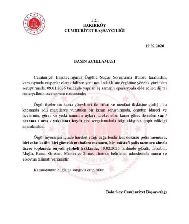 "Cumhuriyet Başsavcılığımız Örgütlü Suçlar Soruşturma Bürosu tarafından, kamuoyunda casperlar olarak bilinen yeni nesil silahlı suç örgütüne yönelik yürütülen soruşturmada, 09.01.2026 tarihinde yapılan eş zamanlı operasyonla elde edilen dijital materyallerin incelenmesi neticesinde;