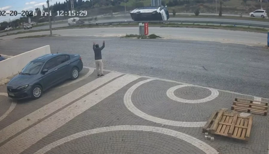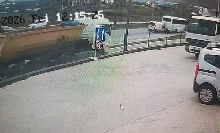 Hafif ticari aracın karayolunda arkadan gelerek midibüse çarpması ve midibüsün kontrolden çıkarak yolun sağına doğru devrildiği anlar güvenlik kamerasına an be an yansıdı.