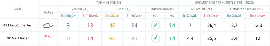 Hafta sonunun ikinci günü olan 8 Mart Pazar günü ise rüzgarın etkisini artırması bekleniyor. Sıcaklığın 0 ile 14 derece arasında değişeceği tahmin edilirken, nem oranının yüzde 50 ile 80 seviyelerinde olacağı bildirildi.