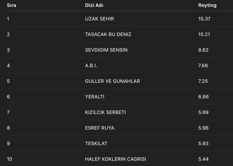 Açıklanan verilere göre "Uzak Şehir" aldığı 15.37 reytingle listenin zirvesinde yer aldı.