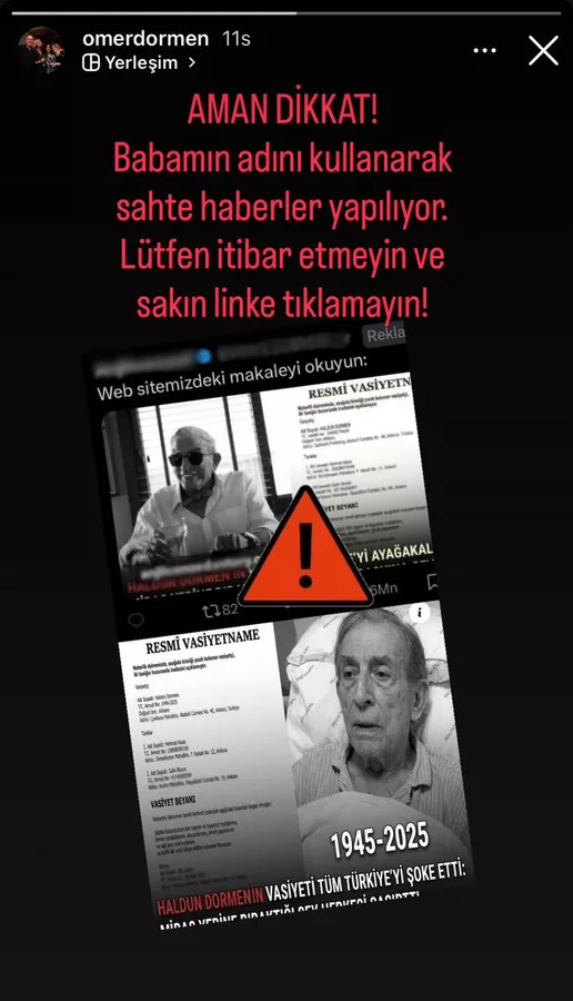 Ömer Dormen, sosyal medya hesabından; "Aman dikkat! Babamın adını kullanarak sahte haberler yapılıyor.