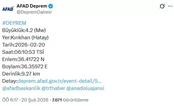 Güncel, 2026.02.20 08:016 Şubat Kahramanmaraş merkezli depremlerde en büyük hasarı alan illerden biri olan Hatay'da korkutan bir sarsıntı daha yaşandı. AFAD verilerine göre Kırıkhan ilçesinde 4.2 büyüklüğünde bir deprem meydana geldi. 9.2 kilometre derinlikte oluşan sarsıntı çevre illerde de büyük paniğe neden oldu.