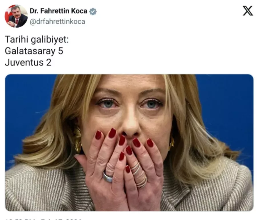Galatasaray, UEFA Şampiyonlar Ligi son 16 play-off turu ilk maçında Juventus'u 5-2'lik ezici bir skorla mağlup ettiği maçın ardından Eski Sağlık Bakanı Fahrettin Koca, Cimbom'un bu başarısını İtalya Başbakanı Giorgia Meloni'nin fotoğrafı ile kutlamıştı.