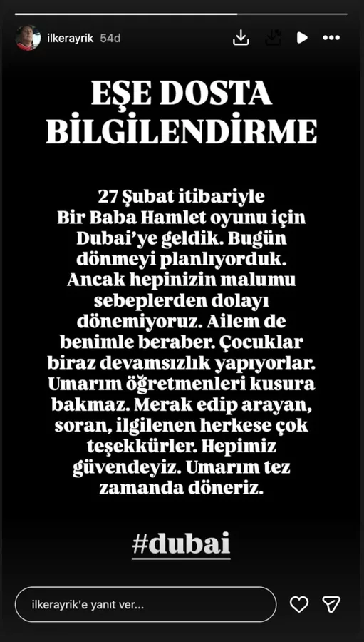 Magazin, 2026.03.02 15:34Oyun için Dubai'ye giden oyuncu Şevket Çoruh ve İlker Ayrık, Dubai'de uçuş iptalleri nedeniyle Türkiye'ye dönemedi. Ailesiyle birlikte orada olan İlker Ayrık, sosyal medya hesabından son durum bilgisi verdi.