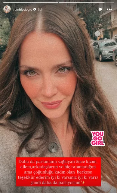 Oyuncu, yayımladığı fotoğrafa, "Beni bugün olduğum noktaya taşıyan, başta kızım olmak üzere aileme, arkadaşlarıma ve çoğu kadın olan, hiç tanımadığım herkese teşekkür ederim. İyi ki varsınız, iyi ki varız... Artık daha güçlü, daha parlak bir şekilde yoluma devam ediyorum" notunu düştü.