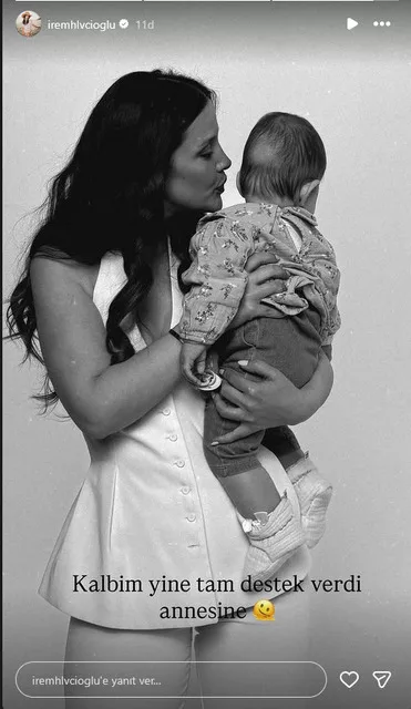 İrem Helvacıoğlu, daha sonra kızı Sora ile olan bir karesini de "Kalbim yine tam destek verdi annesine" mesajıyla takipçilerinin beğenisine sundu.