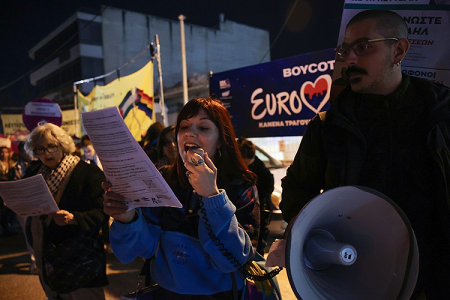 Final organizasyonunun yapıldığı Atina Festival Kompleksi önünde toplanan Filistin destekçileri, İsrail'in 2026 Eurovision Şarkı Yarışması'na katılmasını protesto etti.