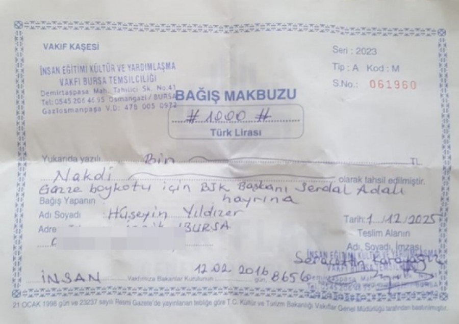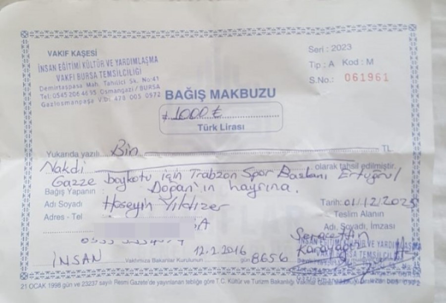 Yıldızer, gerçekleştirdiği bağışla hem Gazze'de yaşananlara yönelik toplumsal duyarlılığı canlı tutmak hem de kulüp başkanlarının aldığı sponsorluk kararını anlamlı bir şekilde desteklemeyi hedeflediğini belirtti.