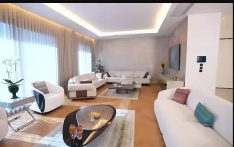 Yüksek tavanlı salonun duvarlarını tablolar ve değerli objeler süslüyor. Krem tonlarının hâkim olduğu, renkli minderlerle hareketlendirilen koltuk takımı mekâna sıcak bir hava katıyor.