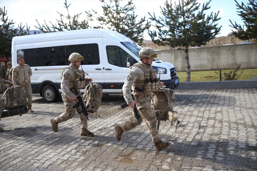 AA ekibinin görüntülediği tatbikatta komandolar, yoğun karla kaplı arazide tek iz oluşturarak ilerledi. Kar kamuflajlarıyla dikkat çeken birlikler, zorlu doğa şartlarında gizlilik ve intikal kabiliyetlerini başarıyla sergiledi.