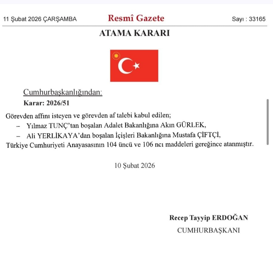 Güncel, 2026.02.11 00:03Resmi Gazete'de yayımlanan Cumhurbaşkanı kararlarıyla İçişleri Bakanlığına Erzurum Valisi Mustafa Çiftçi, Adalet Bakanlığına İstanbul Cumhuriyet Başsavcısı Akın Gürlek atandı.