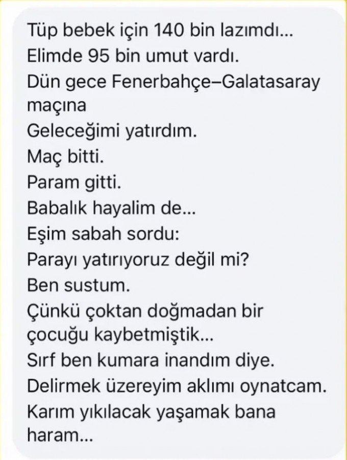 Bir sosyal medya kullanıcısının paylaşımı, okuyanları kahretti. Aylarca süren umut dolu hazırlıklar, tek bir gecede alınan yanlış bir kararla yerle bir oldu. Çocuk sahibi olmak isteyen çiftin hayali, adamın tüp bebek tedavisi için biriktirdikleri 95 bin TL'yi bahiste kaybetmesiyle yıkıldı.