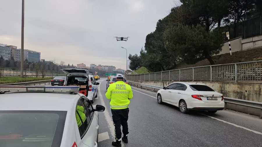 Sarıyer'de taralı alanı ihlal ederek trafikte 'kaynak' yaptığı belirlenen sürücülere yönelik denetim yapıldı. İstanbul İl Emniyet Müdürlüğü Trafik Denetleme Şube Müdürlüğü ekipleri tarafından Maslak TEM Kuzey girişlerinde yapılan dron destekli denetimlerde kural ihlali yapan sürücüler tespit edildi.