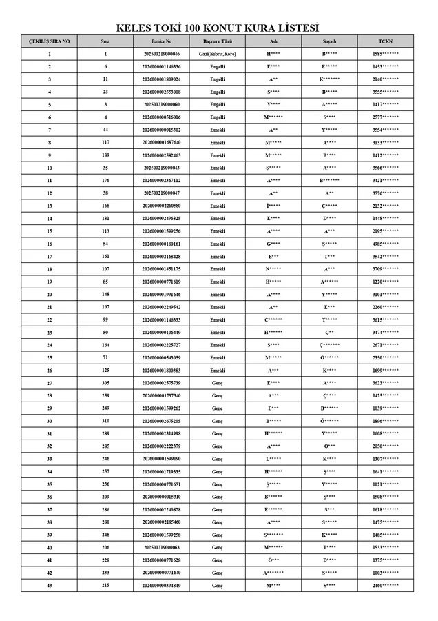 "Keles TOKİ 100 Konut Kura Listesi" başlığıyla ilan edilen sonuçlara göre 100 konut farklı başvuru kategorilerindeki vatandaşlara dağıtıldı.