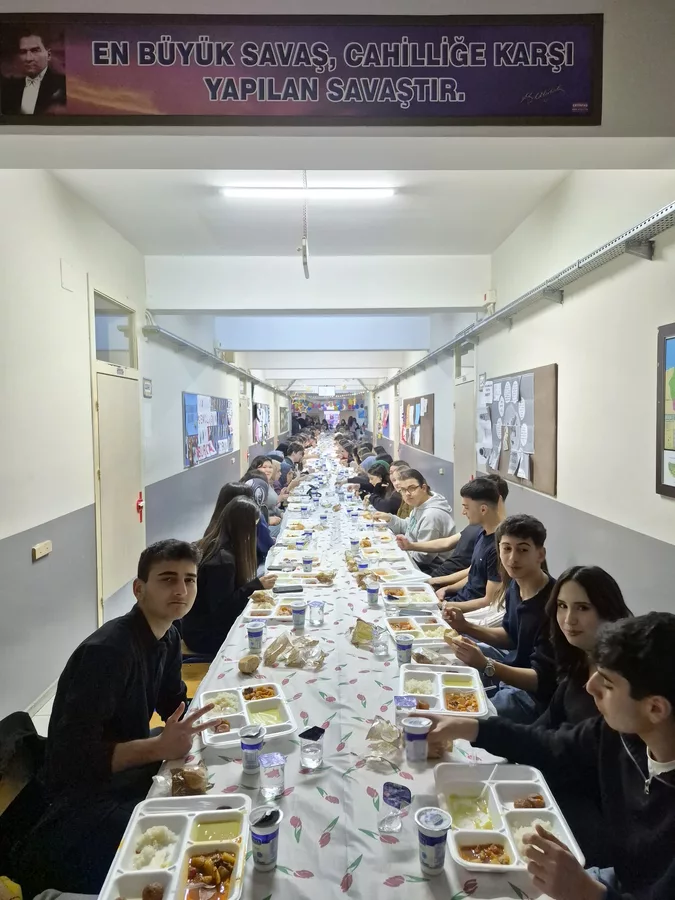 Öğrencilerin paylaşma bilincini geliştiren, yardımlaşma ve dayanışma duygularını güçlendiren, birlik ruhu, adalet, merhamet ile vatanseverlik gibi milli, manevi değerleri pekiştiren etkinlikte çok sayıda öğrenci, okul idarecileriyle iftar yaptı.