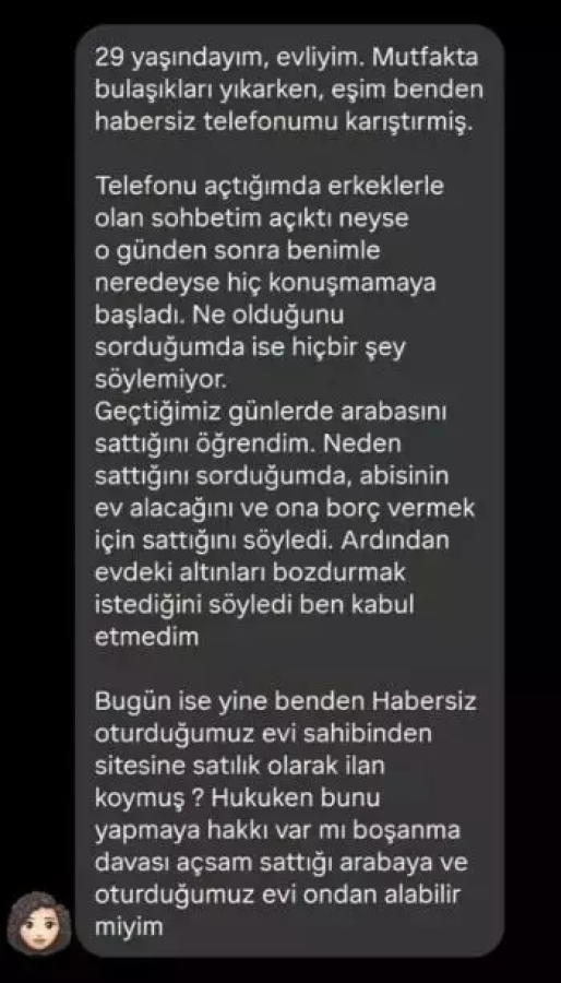 Paylaşımında, eşinin kısa süre önce arabasını sattığını öğrendiğini belirten kadın, "Boşanma davası açsam sattığı arabayı ve oturduğumuz evi ondan alabilir miyim?" sorusunu yöneltti.