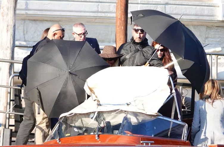 Ünlü oyuncunun sete gelirken görüntülenmesini önlemek için korumaları yoğun çaba sarf etti. Şemsiyeleri açarak Madonna'yı gizlemeye çalıştılar.