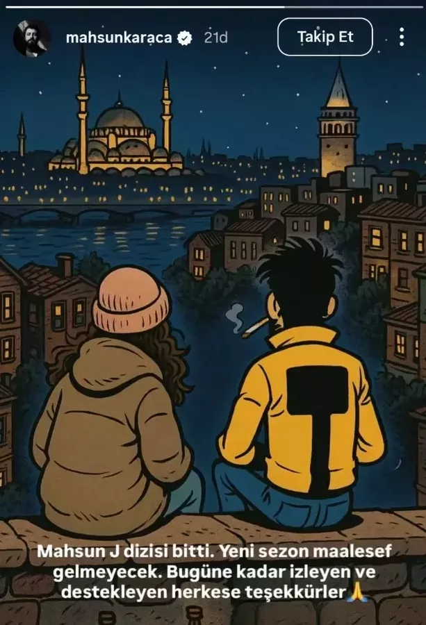 "Röportaj Adam" olarak tanınan Mahsun Karaca'nın başrolünde yer aldığı ve kısa sürede geniş bir izleyici kitlesine ulaşan Mahsun J. dizisinden kötü haber geldi. Karaca, sosyal medya hesapları üzerinden yaptığı açıklamada dizinin resmen sona erdiğini ve yeni sezonun çekilmeyeceğini duyurdu.