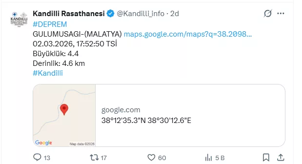 Güncel, 2026.03.02 17:59Kandilli Rasathanesi açıklamasına göre Malatya'da 4.4 büyüklüğünde bir deprem meydana geldi.
