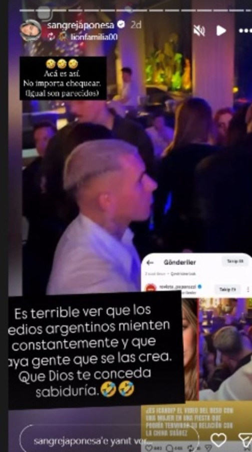 Arjantin basınından Paparazzi'nin adlı yayın organına göre, partideki sarışın, siyah ceketli bir erkek genç bir kadınla öpüşürken görüntülendi. O erkeğin de Mauro Icardi olduğu iddia edildi.