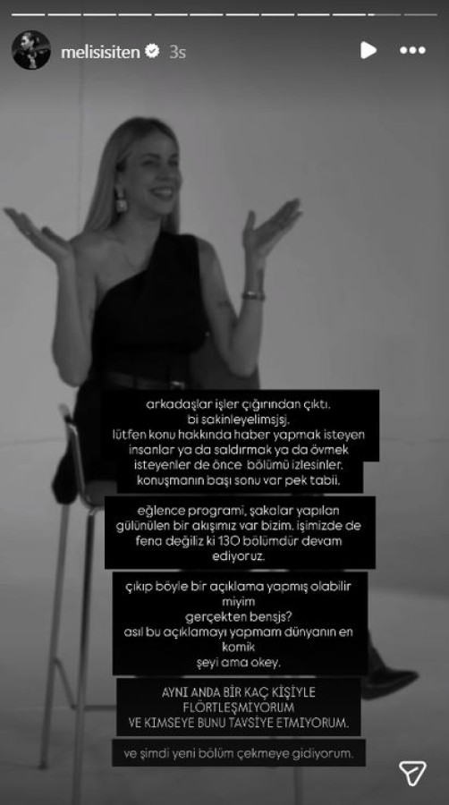 Melis İşiten paylaşımında şu ifadeleri kullandı; "Arkadaşlar işler çığırından çıktı, bir sakinleşelim. Lütfen konu hakkında haber yapmak isteyen ya da saldırmak veya övmek isteyen herkes önce bölümü izlesin. Konuşmanın başı sonu var elbette. Biz bir eğlence programıyız; şakaların yapıldığı, gülünerek ilerleyen bir akışımız var. Üstelik 130 bölümdür de devam ediyoruz.