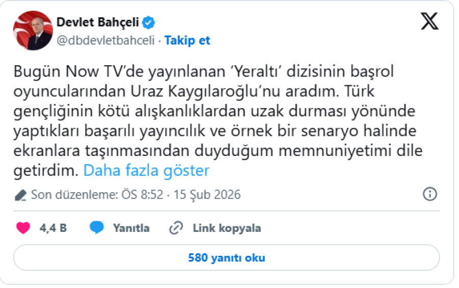 Güncel, 2026.02.15 21:31Milliyetçi Hareket Partisi (MHP) Genel Başkanı Devlet Bahçeli, özel bir televizyon kanalında yayınlanan "Yeraltı" dizisinin başrol oyuncularından Uraz Kaygılaroğlu'nu arayarak, diziden duyduğu memnuniyeti dile getirdi.