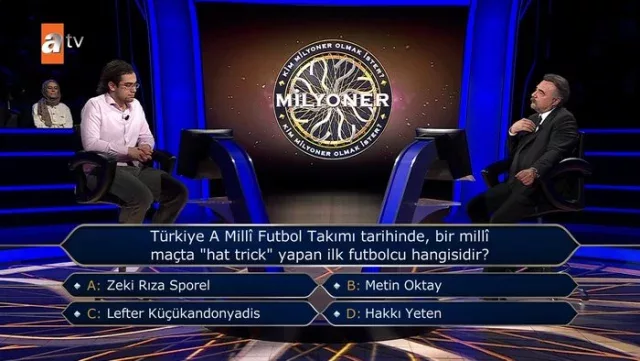 Magazin, 2026.04.27 11:32Kim Milyoner Olmak İster'de 18 yaşındaki yarışmacı 1 milyon TL'lik soruya kadar yükseldi. Türkiye A Millî Takımı tarihinde hat-trick yapan ilk futbolcunun sorulduğu kritik soruda ise risk almayan yarışmacı çekilmeyi tercih etti.