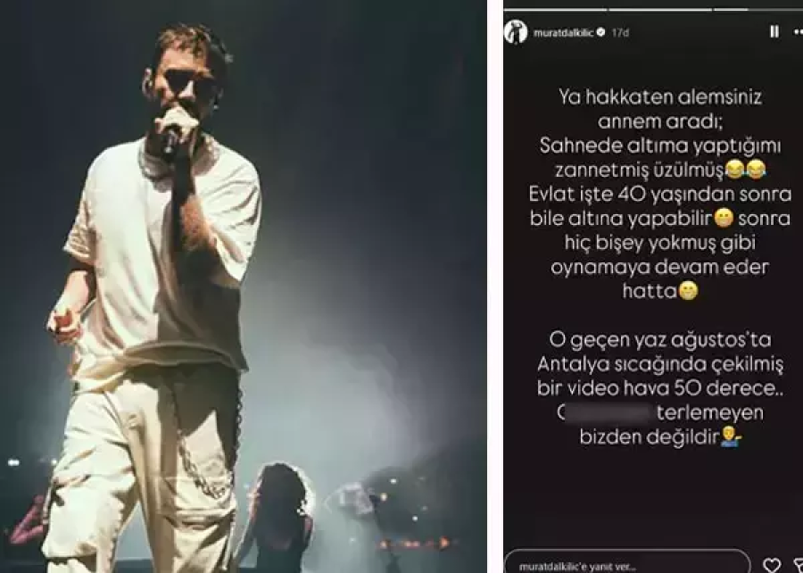Ünlü şarkıcı Murat Dalkılıç, sosyal medyada dolaşıma sokulan konser videosuyla ilgili yanıt hakkını kullandı. Konser sırasında çekilen görüntülerde Dalkılıç'ın pantolonunun arka kısmındaki ıslaklık gündem oldu. Gelen yorumların ardından açıklama yapan Dalkılıç, annesinin kendisini arayarak endişelendiğini söyledi.