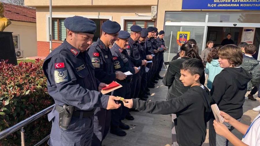 Bursa Bölge, 2026.02.26 12:33Bursa'da Ali Durmaz İlköğretim Okulu öğrencileri, Nilüfer İlçe Jandarma Komutanlığını ziyaret ederek jandarma personeliyle bir araya geldi. Miniklerin elleriyle yazdığı mektupları teslim alan jandarma ekipleri duygu dolu anlar yaşadı.