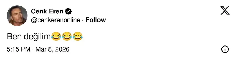 Ünlü sanatçının bu sözleri kısa sürede sosyal medyada gündem oldu. Cenk Eren'den de esprili br yanıt geldi. Duru'nun yakın dostu olana Eren "Ben değilim" dedi.