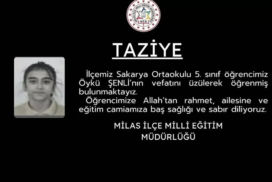 Öte yandan, Milas Milli Eğitim Müdürlüğü'nün sanal medya hesabından yapılan paylaşımda, "İlçemiz Sakarya Ortaokulu 5'inci sınıf öğrencimiz Öykü Şenli'nin vefatını üzülerek öğrenmiş bulunmaktayız. Öğrencimize Allah'tan rahmet, ailesine ve eğitim camiamıza başsağlığı ve sabır diliyoruz" denildi.