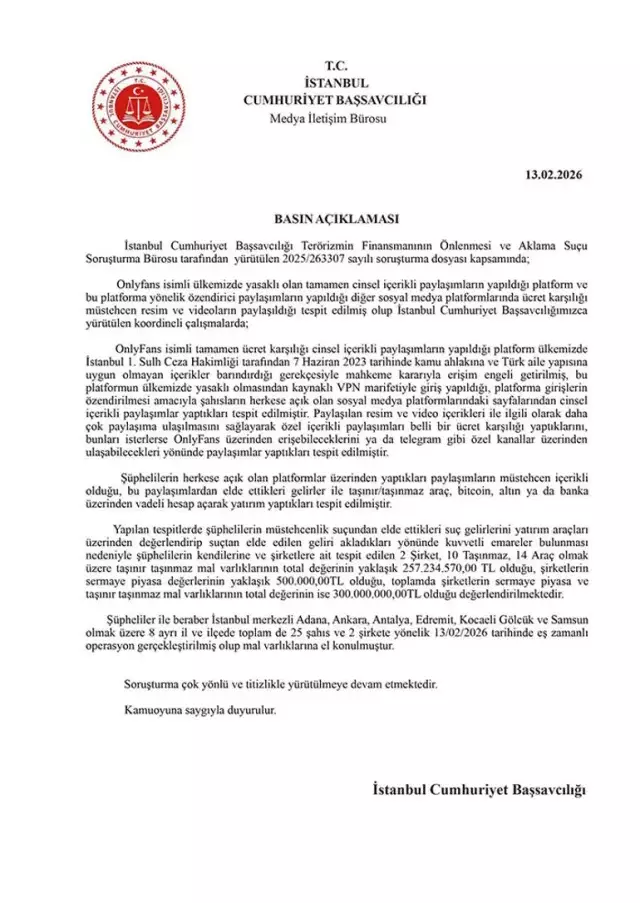 Operasyona dair yapılan açıklamada şu ifadeler yer aldı: "Onlyfans isimli ülkemizde yasaklı olan tamamen cinsel içerikli paylaşımların yapıldığı platform ve bu platforma yönelik özendirici paylaşımların yapıldığı diğer sosyal medya platformlarında ücret karşılığı müstehcen resim ve videoların paylaşıldığı tespit edilmiş olup İstanbul Cumhuriyet Başsavcılığımızca yürütülen koordineli çalışmalarda; OnlyFans isimli tamamen ücret karşılığı cinsel içerikli paylaşımların yapıldığı platform ülkemizde İstanbul 1. Sulh Ceza Hakimliği tarafından 7 Haziran 2023 tarihinde kamu ahlakına ve Türk aile yapısına uygun olmayan içerikler barındırdığı gerekçesiyle mahkeme kararıyla erişim engeli getirilmiş, bu platformun ülkemizde yasaklı olmasından kaynaklı VPN marifetiyle giriş yapıldığı, platforma girişlerin özendirilmesi amacıyla şahısların herkese açık olan sosyal medya platformlarındaki sayfalarından cinsel içerikli paylaşımlar yaptıkları tespit edilmiştir.