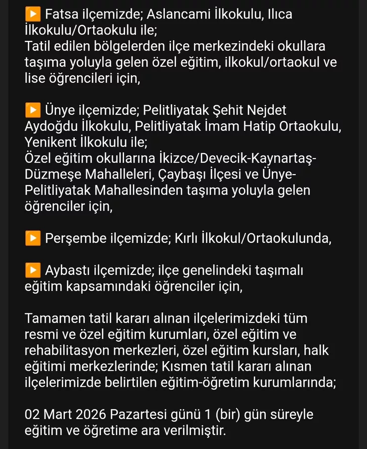 Valilikten yapılan açıklamada, ilin iç kesimlerinde devam eden yoğun kar yağışı ve yollarda oluşan buzlanma nedeniyle Akkuş, Çaybaşı, Gölköy, Gürgentepe, İkizce, Kabadüz, Kabataş, Mesudiye ve Ulubey ilçelerinin tamamında eğitim ve öğretime 2 Mart Pazartesi günü 1 gün ara verildiği belirtildi. Fatsa, Ünye, Perşembe ve Aybastı ilçelerinde ise eğitim ve öğretime kısmi olarak ara verildiği ifade edilen açıklamada, "Eğitim-öğretime tamamen ara verilen ilçelerimizde kamu kurum ve kuruluşlarında çalışan hamile ve engelli personeller ile çocuğu kreş ve anasınıfına devam eden anneler aynı gün idari izinli sayılacaktır. Sağlık, güvenlik, 24 saat esasına göre hizmet veren birimlerde çalışan personelin durumu hizmetin gereği olarak ilgili birimler tarafından değerlendirilecektir" denildi.