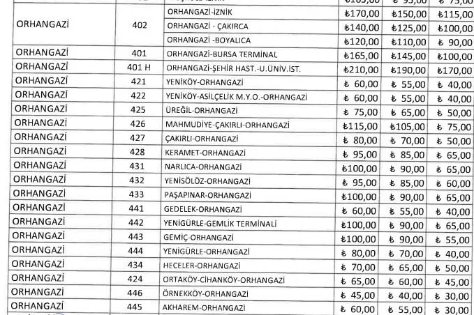 Yapılan düzenlemeyle birlikte Orhangazi-Bursa hattında yolcu ücreti 140 TL'den 165 TL'ye yükseldi. Aynı hatta öğrenci tarifesi ise 100 TL olarak belirlendi.