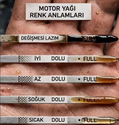 Öte yandan yağın rengi de dikkat edilmesi gereken bir diğer unsur. Açık kehribar tonundaki yağ "iyi" olarak değerlendirilirken, koyu ve siyaha yakın renkler yağın kirlenmiş olduğunu ve değişim zamanının geldiğini gösteriyor. Görselde en üstte yer alan koyu renkli örnek, "değişmesi lazım" uyarısıyla dikkat çekiyor.