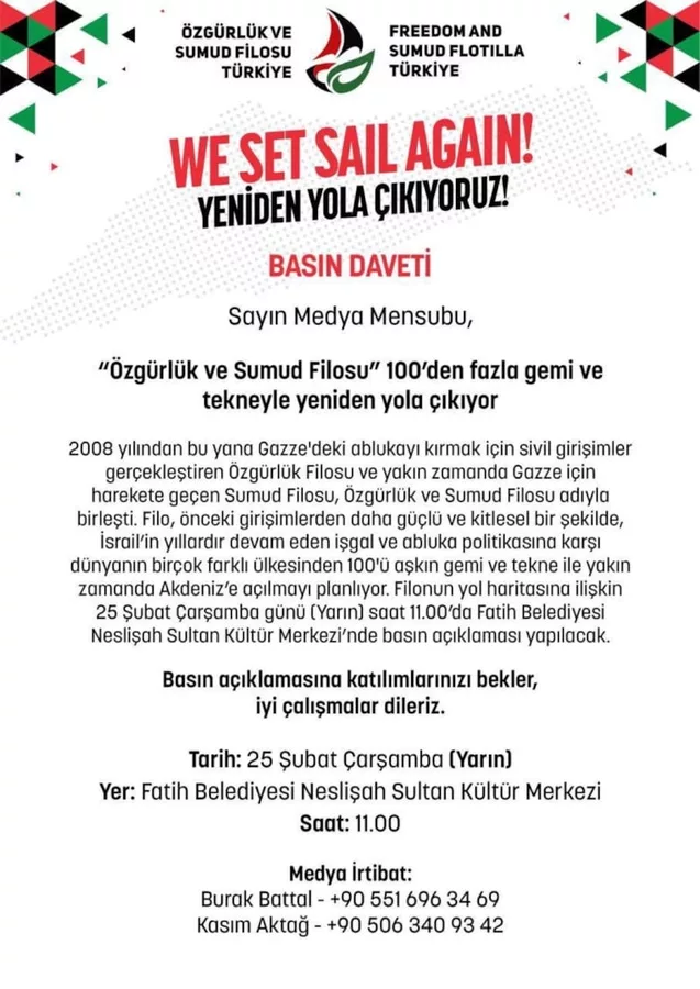 Özgürlük ve Sumud Filosu Türkiye Yönetimi tarafından organize edilecek basın toplantısında, önceki filolarda aktif olarak yer almış Madleen ve Sumud katılımcısı Şuayb Ordu, Sumud Katılımcısı ve Yönetim Kurulu Üyesi Sümeyra Akdeniz Ordu, filoya katılabilmek için Birleşmiş Milletler Genel Sekreterliği çalışanlığından istifa eden Hanzala Gemisi katılımcısı Chloe Ludden ve çok sayıda aktivist bulunacak.