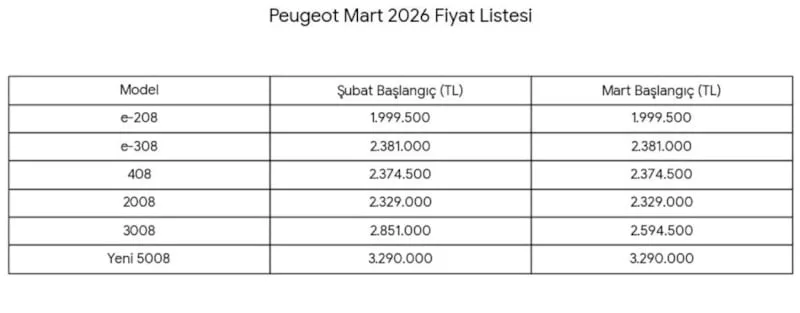 Fransız otomobil üreticisi Peugeot, Mart 2026 dönemi için yeni fiyat listesini duyurdu.