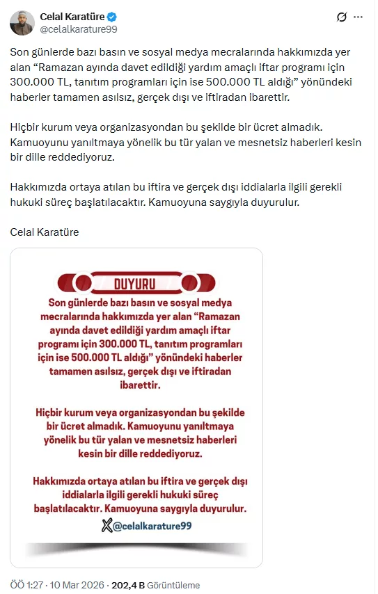 Son günlerde bazı basın ve sosyal medya platformlarında yer alan iddialara değinen Karatüre, Ramazan ayında davet edildiği yardım amaçlı iftar programı için 300 bin TL, tanıtım programları için ise 500 bin TL aldığı yönündeki haberlerin tamamen asılsız olduğunu söyledi. Söz konusu haberlerin gerçeği yansıtmadığını vurgulayan Karatüre, hiçbir kurum ya da organizasyondan bu şekilde bir ücret almadığını ifade etti.