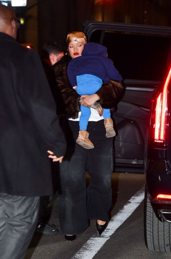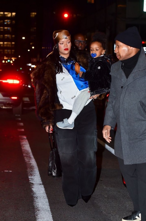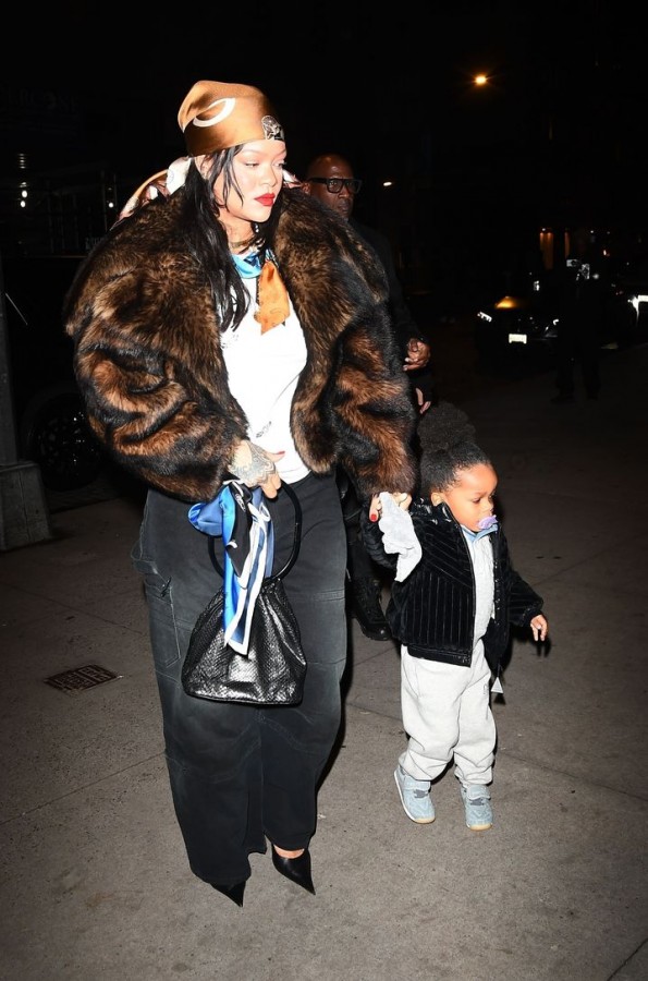 Oğullarından birini kucağına aldığı görülen Rihanna, kürk manto ve saten başörtüsü kombiniyle dikkat çekti.