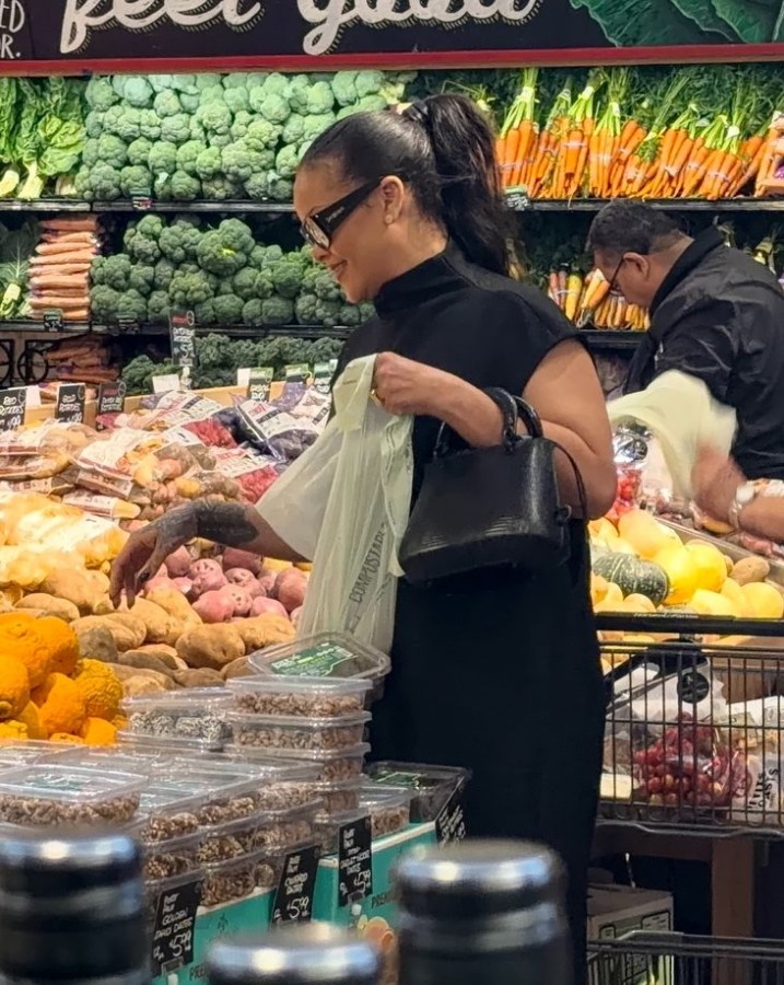 Kendi alışveriş arabasını taşıyıp, sebze ve meyve reyonunda seçtiklerini tek tek poşetlere dolduran Rihanna, etraftaki diğer müşterilerin meraklı bakışları arasında alışverişini tamamladı.