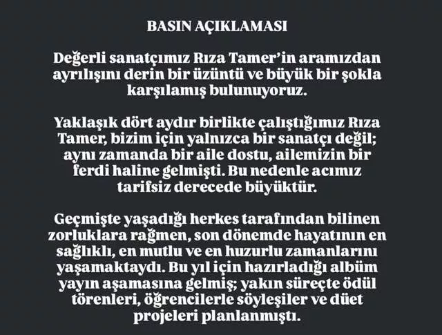 Açıklamada şu ifadelere yer verildi: Değerli sanatçımız Rıza Tamer'in aramızdan ayrılışını derin bir üzüntü ve şokla karşıladık. Yaklaşık dört aydır birlikte çalıştığımız Rıza Tamer, bizim için yalnızca bir sanatçı değil, aynı zamanda bir aile dostu ve ferdi haline gelmişti. Bu nedenle acımız tarifsizdir. Geçmişte yaşadığı bilinen zorluklara rağmen, son dönemde hayatının en sağlıklı, mutlu ve huzurlu günlerini geçirmekteydi. Bu yıl için hazırladığı albümü yayın aşamasına gelmiş; yakın süreçte ödül törenleri, öğrenci söyleşileri ve düet projeleri planlanmıştı.